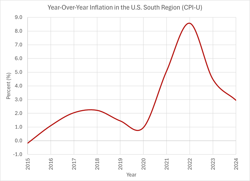 A lot of affordability challenges are caused by inflation. For a family, inflation is the decrease in spending power given the same amount of salary or other financial resources. The U.S. Bureau of Labor Statistics is responsible for measuring inflation each month through the Consumer Price Index. And while the Bureau doesn’t present data at the state level, it does for four regions, including the South. In our region, inflation peaked at nearly 9% in 2022 and has been coming down since. But 2024 ended with 3% inflation, and 2025 is similar so far; inflation in September 2025 — the latest data we have — is up 2.7% compared to September 2024.