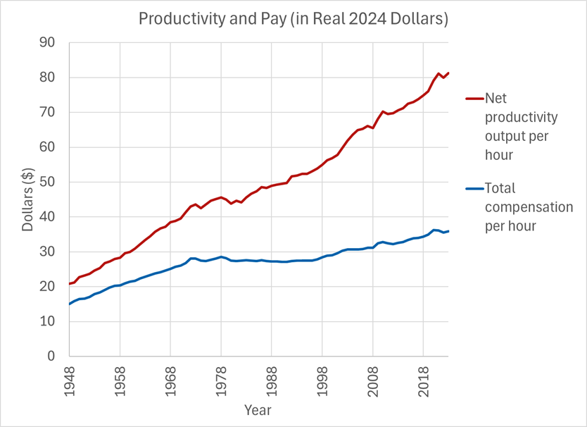 Beyond the minimum wage, there is additional evidence that wages are not keeping up. Since World War II, productivity has rapidly increased in the United States. This means that American — and Arkansan — workers are creating more value for every hour worked. All of us are working harder. But at the same time, compensation for that work has only modestly increased. This widening gap is carried by workers and their families. The workers who have made the American economy strong.