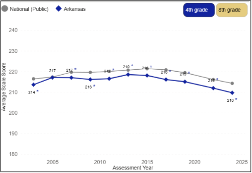The results of the assessment are categorized as basic, proficient, and advanced achievement levels. The percentage of students in Arkansas meeting the basic achievement level in 4th grade reading has decreased since 2015, and the state’s overall reading score in 4th grade has decreased in the last decade, as shown on the line graph above comparing Arkansas and the national average score. No state made gains in reading in 2024.