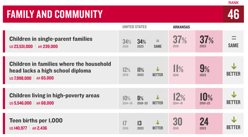 “Family and Community” is one of four domains the Annie E. Casey Foundation analyzes to determine whether children across the country are getting what they need to be successful and to thrive. Among the states across the nation, Arkansas ranks 46th in the Family and Community category in the 2025 KIDS COUNT® Data Book. While Arkansas has a long way to go, this ranking is meant to drive improvement rather than dwell on current deficits.